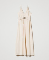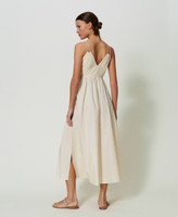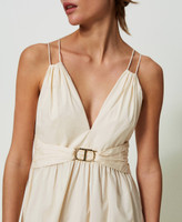 Long stretch cotton poplin dress with V neck on front and back, gathered waist and waistband with Oval T buckle, side zip.
