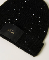 Sequins all over for the lurex beanie with logo label appliquéd in front. Contemporary appeal that completes all your outerwear, also with matching scarf.