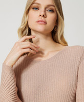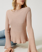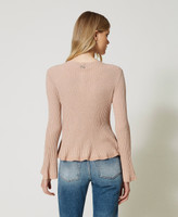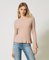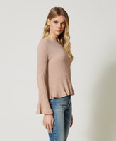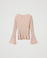 Stretch viscose blend and lurex jumper with pleated hem, round neck, long sleeves, flared fit.