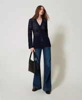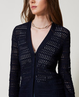Openwork cardigan made from viscose blend crêpe. V-neck, long sleeves, matching fabric covered buttons. Oval T logo plate at the back, loose fit.