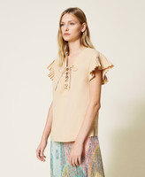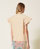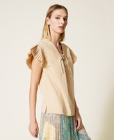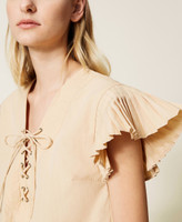 Cotton blend poplin top with pleated stitching, plunge V neck with ribbon and eyelets.