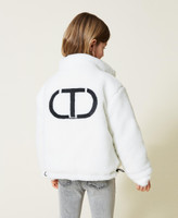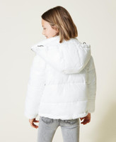 Reversible short puffer jacket with quilted nylon on one side and faux fur with logo on the other.