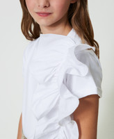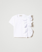 Stretch cotton jersey short sleeve T-shirt with asymmetric poplin ruffles.