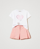 Girls' outfit comprising regular jersey T-shirt with print, rhinestone appliqués, short sleeves, and poplin shorts with zip and button fastening, side pleats, straight fit.