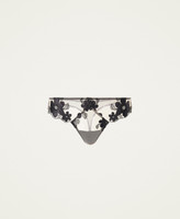 The tulle g-string boasts a patch and thread floral embroidery in front, with solid colour tulle and scalloped elastic on the back. Invisible even under the tightest garment.