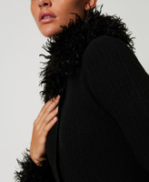 Wool blend and faux fur long ribbed cardi-dress. Removable faux fur neck and cuffs, round neck, covered button fastening, long sleeves, fitted.