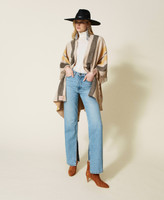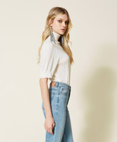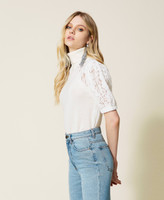 Wool blend jumper with see-through macramé lace insert, roller neck, short sleeves, regular fit.