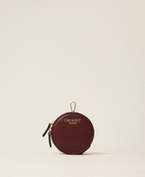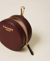 Smooth faux calfskin leather coin holder with metal lettering logo. Cylindrical shape, key ring and carabiner, double zip closure.