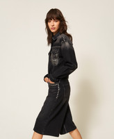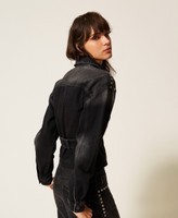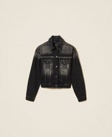 Actitude collection stretch cotton denim jacket with hotfix studs at the yoke and on the shoulders. Shirt collar, long sleeves with buttoned cuffs, adjustable strap at the back, patch pockets, stone wash lightening at the front, straight fit.