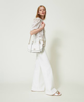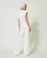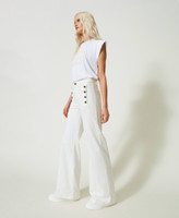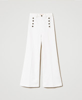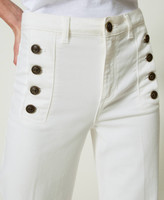 Flared jeans made from white stretch cotton denim, navy-style buttons in front, belt loops, zip and stud button.