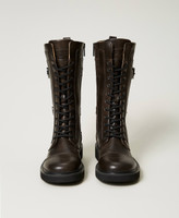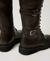 High lace-up combat boots with straps and buckles at the side, side zip fastening, rubber sole.