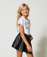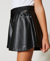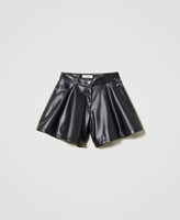 Leather-like shorts with pleated, flared fit, side pockets with rhinestone rivets, zip and snap button, lined with muslin.