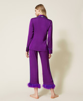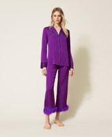 Satin mannish pyjamas consisting of tunic with buttons and wide trousers with feather trim.