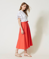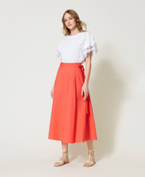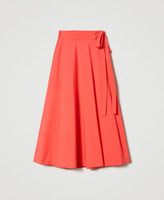 Long wrap-around skirt made from stretch cotton poplin, flared fit, side closure with sewn belt, unlined.