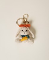Hand crocheted cotton rabbit key ring. It has gold-tone carabiner, split ring and logo plate.