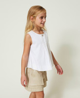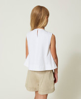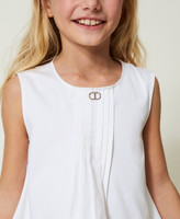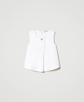 Sleeveless stretch cotton satin top with pleats on the front, flared hem, teardrop opening and button on the back.