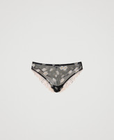 Brazilian briefs made from tulle with daisy print all over, scalloped elastic at the waist, lace trim on the back.