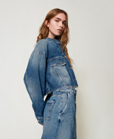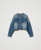 Actitude collection cropped denim jacket with localized discolourations, mandarin collar, button fastening, sewn flap pockets, frayed hem, straight fit.