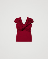 Fitted top made from shiny viscose jersey with draping and criss-cross in front that can be worn on or off-shoulder.
