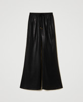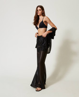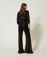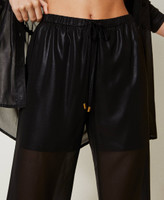 Laminated georgette trousers with elasticated waist and drawstring with metal ends, crêpe de Chine lining shorts, heart-shaped logo on the back, flared fit.