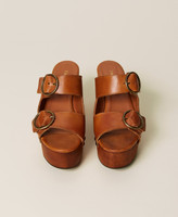 Leather sandals with nailed wooden platform, double band with buckle, rubber sole.