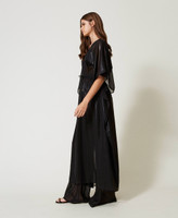 Long laminated georgette kaftan with drawstring at the waist with metal ends. V-neck, short kimono sleeves, elastic smocking at the waist, side seams, heart-shaped metal logo at the back, loose fit.