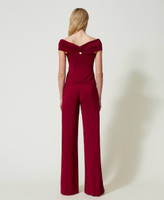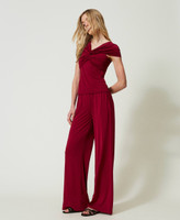 Choose the palazzo trousers made from shiny stretch viscose jersey with elasticated waist, slant pockets and metal heart-shaped logo on the back. Perfect for cosy looks, but also for special occasions with their matching top.
