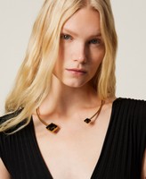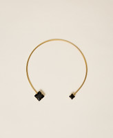 Brass choker necklace with rhinestones and engraved logo. The metal is flexible for easy wear.