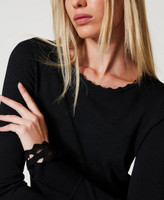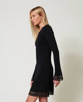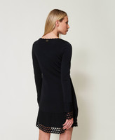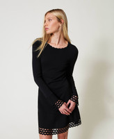 Short plain knit dress made from stretch viscose crêpe with à jour stitch geometric pattern at the hem. Scallop trim crew neck, long sleeves, Oval T logo plate on the back, slightly flared fit.
