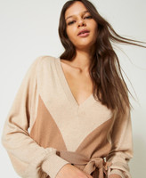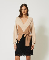Exquisite work for the wool blend dress with placed colour block diamond pattern inlay and scalloped macramé lace border embroidered at the hem, crêpe de Chine lining. Loose fit, V neck, long raglan sleeves with ribbed finish, removable knit belt with side belt loops. Perfect noon to night.