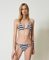 Two-tone striped jacquard bikini set with cutwork embroidery and rhinestones, consisting of a padded triangle top with removable cups and thongs with laces.
