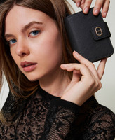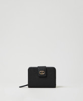 Wallet made from faux Saffiano grain leather with non-scratch treatment, strap and metal Oval T snap button closure, zipped pocket for coins, inner compartment with card holder and ID holder.