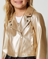 Glam charm for this Girls’ biker jacket made from fabric with platinum gold-tone coating. Asymmetric metal zip, mock welt pockets in front, metal zip at the cuff, metal buttons on the lapel, tonal stitching, lining. Add sophisticated boldness to her special occasion looks.