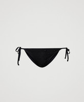 Brazilian bikini bottom made from solid colour fabric doubled with rhinestone mesh, with adjustable laces on the side and small logo plate on the back.