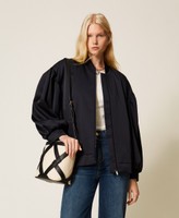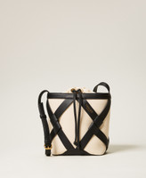 Natural canvas bucket bag with smooth faux calf leather structure and finishes. Drawstring closure, adjustable shoulder or cross-body strap, metal lettering logo.