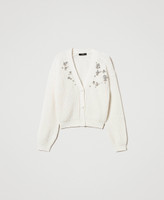 Actitude collection short cob stitch knit cardigan with handmade embroidery. Ribbed trim, V neck, crochet button fastening, long sleeves, metal logo in the centre at the back, regular fit.