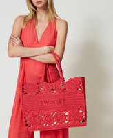 Hand-made crochet shopper with floral design, double tubular handle, embroidered logo, removable canvas inner bag with drawstring.