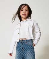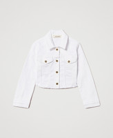 Girls' cropped stretch bull denim jacket with collar, metal logo button fastening, mock flap pockets, frayed he, straight fit.