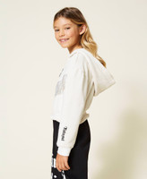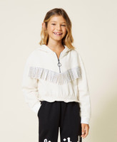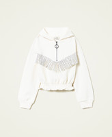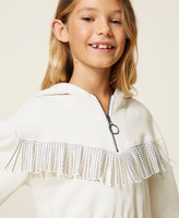 Brushed cotton with tonal suede fringes and rhinestone inserts, elasticated hem, zip opening.