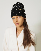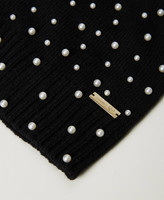 Knit beanie with riveted pearls, ribbed border and logo plate.
