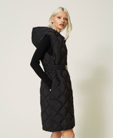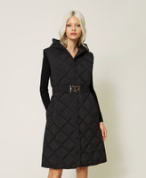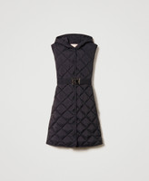 Padded gilet made from lightweight technical fabric, diamond quilted, hood, elasticated belt with Oval T buckle.