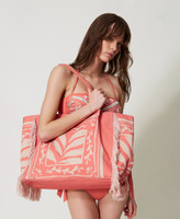 Natural canvas shopper with a collection graphic print. Featuring a double handle in tonal webbing for carrying by hand or on the shoulder, frayed edges and magnetic closure.