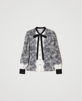 Crêpe de Chine shirt with placed lace-like print, pussy bow, covered button closure.