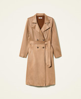 Raw cut trench made from slanted scuba with suede-like effect, double-breasted closure with buttons, no lining.