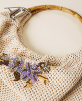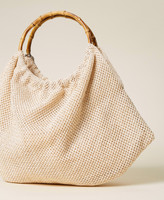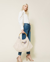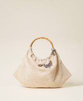 Actitude collection shopper with weaved straw effect, double bamboo handle, floral embroidery, logo charms.