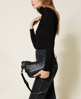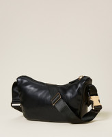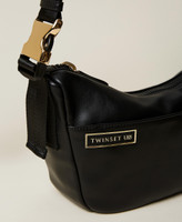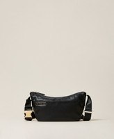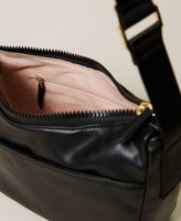 Calfskin-like zipped bag in the shape of a squared crescent, adjustable ribbon strap, logo label.