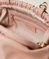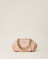 Soft clutch bag with gathering, metal Oval T logo, snap closure, decorative light resin chain.