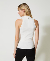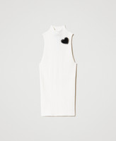 Seamless ribbed stretch viscose top with turtleneck, no sleeves, brooch with thread and bezel embroidery.