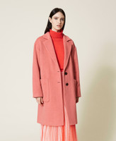 Loose fitting coat made of brushed wool blend cloth, with lapels, button closure, appliquéd pockets.