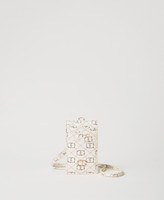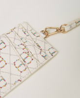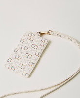 Saffiano print leather-like card holder with asymmetric compartments, removable strap with carabiner, metal Oval T logo.